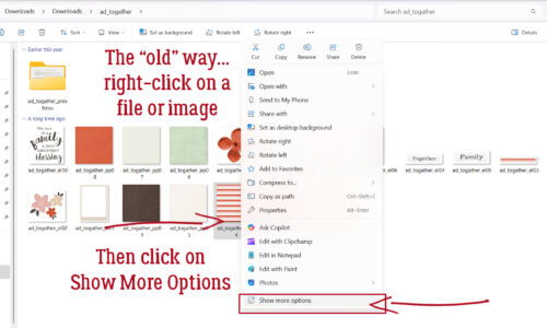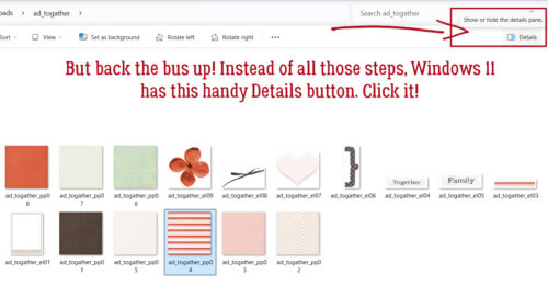 Remember I mentioned finding that folder labeled Downloads INSIDE MY DOWNLOAD FOLDER last week? Well, it had a bunch of free templates from the now-defunct A Love For Layout Templates Facebook group in it. And for most of them, the folder labels gave me no clue as to when I downloaded them. I NEED to know that so that when I use them I can credit them properly. So what could I do to sort that out? Well… I discovered a Windows 11 feature I’d been sleeping on. The Detail Pane.