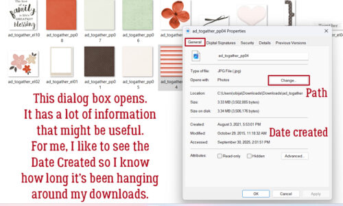 Yet another dialog box opens up. (This is where the name Windows comes from! 😉 ) It’s the General Properties pane and is helpful in a few ways. Here, you can Change the application used to open files like this one by clicking on that Change button. It shows the Path your system used to find the file, and it shows the Date the file was created. AHA! Now I can tell when this minikit was put together. (Yeah. I had files in that subfolder that are more than 10 years old. Gah.)