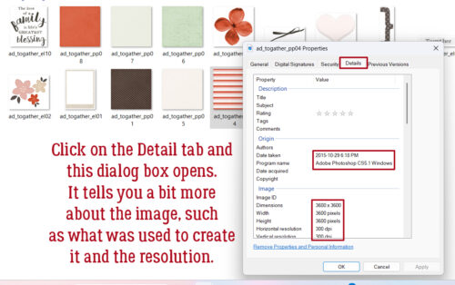 If I wanted to know even more, I could take Step Four and click on the Details tab in this pane. Here, I found information about that creation date and what software was used to create it, as well as size and resolution. To make it get gone, I can X out of it.