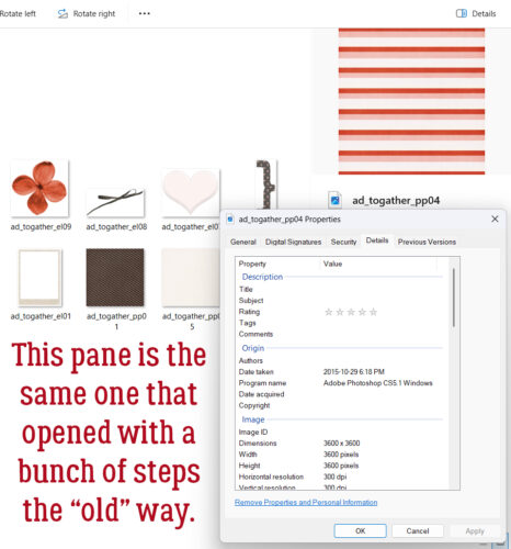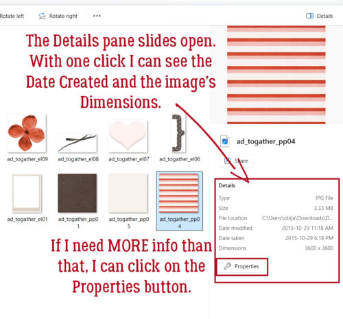 The Details pane slides open from the right hand side of the screen. Holy cow… with ONE click, I can see the creation date and dimensions! If I want more info, I can click on the Properties button.