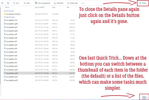 To close the Details pane, I just clicked on the Details button up there at the top right again and it went away. And that’s it! But before I close this up and post it, I wanted to share just one more little Quickie… Down there in the bottom right corner there are two little icons. The one on the left is a stack of lines and the other looks a bit like a flatscreen TV. You can toggle between a list of files in the folder – the stack of lines, and thumbnail images of all the files in the folder – the flatscreen! The “old way” has more steps…