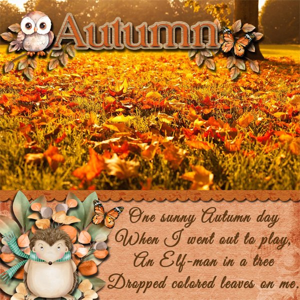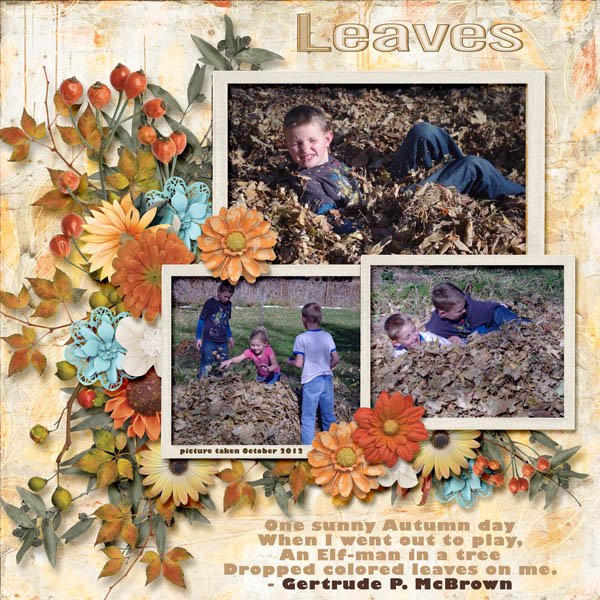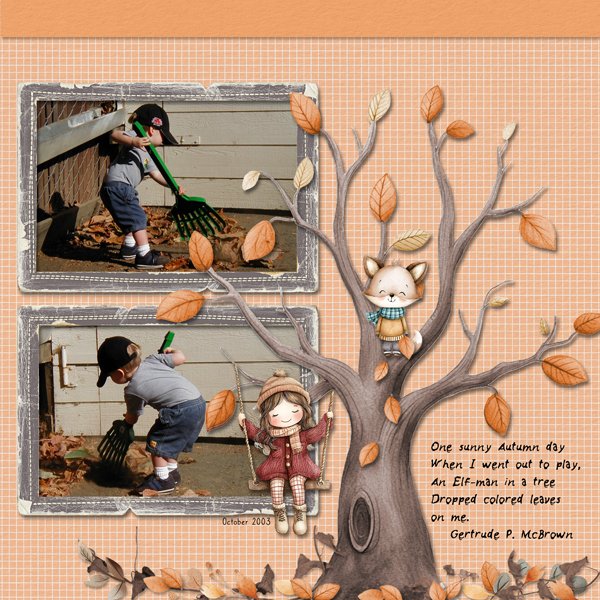 First off the bat we have trinanne. She went with the elf quote and used photos of a charming little man busily raking leaves. I like the simplicity of her layout, and her clever use of the partially-nude tree element to reflect the theme of the layout.