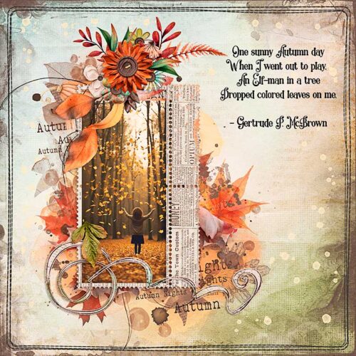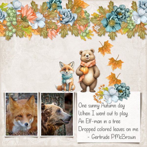 I LOVE this one! Grace.‘s imagination and nature play well together. The drift of leaves draws the eye to the quote, but also to the little fox and bear elements. So pretty!