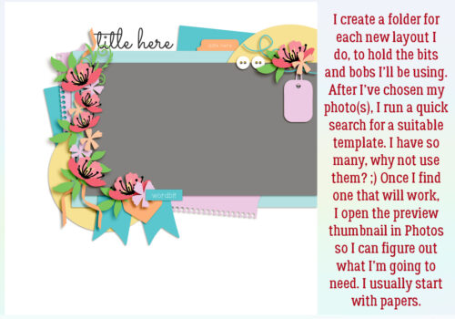 My process is usually: open a new folder > choose a theme (for Challenges, for example) > find photo(s) > template > papers > embellishments > title. I add the tools to the folder as I go along. Once I’ve chosen a template, I open the preview thumbnail and enlarge it so I can see all the parts it contains. Then I can start pulling pieces to build my layout with. I start with the papers… count then up so I know how many I’m looking for.