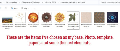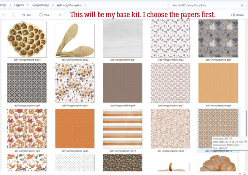 In keeping with my theme, I’ll look at a few kits that fit, looking into the folders for the major parts of the template I’m using. For this layout, I chose Alexis Designs’ Ivory Pumpkins as my base kit.