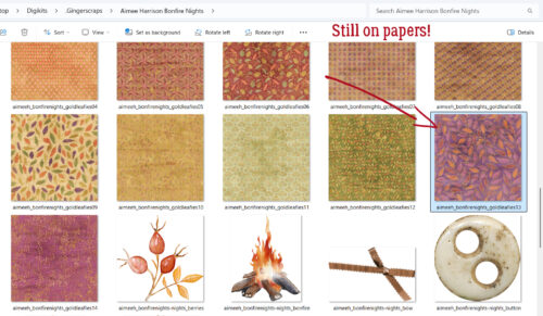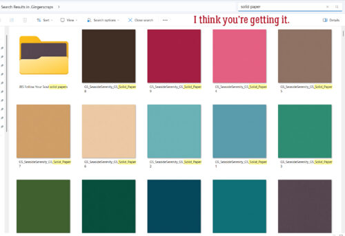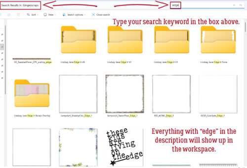 I’ve selected the papers I want to use, but I feel like the edge of the background paper needs a little something. So I turned to the Search function in File Explorer. All of my GingerScraps kits are in a single super-folder so I’ve got that open as my primary search location. In the Search field at the top right of the screen, I typed in “edge” and let my computer do the work. It usually takes under a minute. As you can see, EVERYTHING with the keyword “edge” anywhere in the metadata shows up in the workspace. 🙂 I chose one and moved on.
