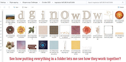 Now I’ve selected all the things I want to use to create my layout and moved a Copy of each into my folder. I can see clearly whether they’re all going to play well together. I think it’ll work!