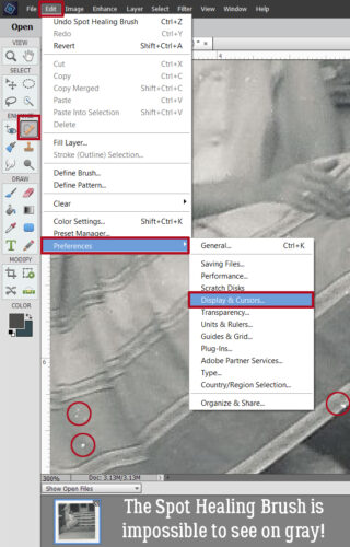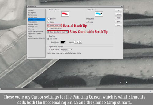 These were the settings I was working with for the Painting Cursor, which is what Elements classifies both the Spot Healing Brush and the Clone Stamp. These settings were Normal Brush Tip and Show Crosshair in Brush Tip. That setting appears as a circle with crosshairs inside it. It shows up well on white – it turns black and pops nicely – and black, because it’s white. But any shade of gray and it’s totally invisible to me.