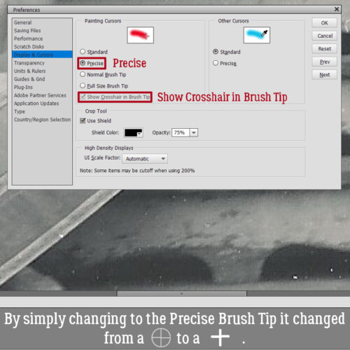 I tested some other options and didn’t like the ones that use an eye-dropper icon. When I switched to Precise and left the Crosshair box ticked. the cursor changed from that faint circle with the crosshairs to just a plus sign, but it was infinitely more visible even against most shades of gray. The one drawback is that the SIZE of the Brush Tip isn’t obvious with this setting. The Shield will appear when you click the Brush over a spot, and you’ll have an idea of size that way. I can live with that.