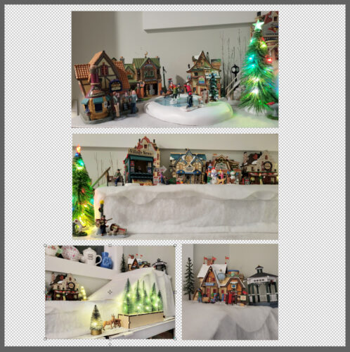 In this screenshot you can easily see the white strip! Another feature of Connie‘s templates is that she doesn’t pre-shadow, so I can decide how I want those two photos to look in the finished layout. I just moved some of the layers at the bottom up a bit to help hide the ugly fake snow bit. The smaller photo spots needed minor adjustments too, the left one tilted into landscape orientation and the right one downsized into a more square shape.