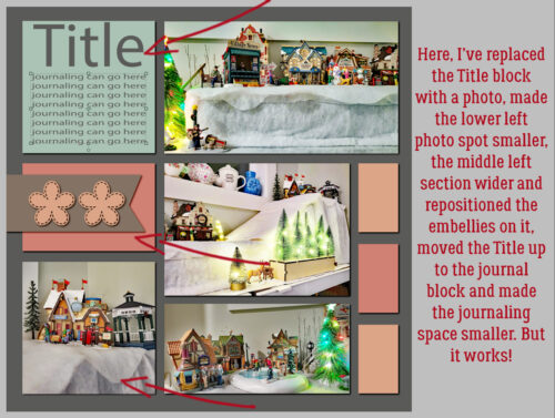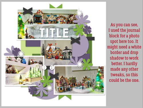 Again, I used the journal block as a photo space, which may or may not need a white border and drop shadow. The title can cover up that nasty fake snow in the top photo. The photo spots were all resized in one dimension or both, to suit the photos better. But doing so didn’t mess up the overall look. Tinci‘s templates are really easy to customize.
