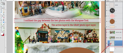 And I can use that paper circle to hide a multitude of sins… Once I fit the photos into the spot edge-to-edge – I DID NOT Clip the photos to the spot – I created a gap between the bottom of one and the top of the other. I made sure the gray photo spot layer was the active layer. Then I used the Marquee Tool to outline that gap.