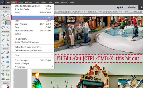 Then I Edit>Cut [CTRL/CMD>X] the gray bit out of that gap. The white paper creating the border around the spot remains untouched.