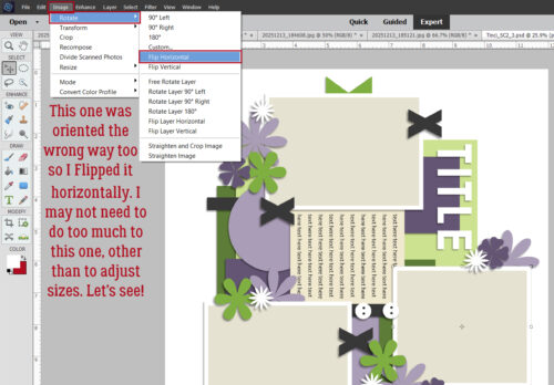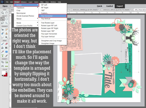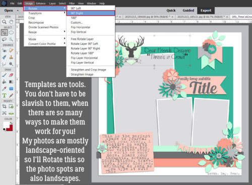 Don’t forget that templates are tools. They’re blueprints, but unlike blueprints, they don’t require absolute slavish devotion to any part of them. There are no rules about adding, subtracting, moving, turning, flipping or substituting any part of them. You can even merge two templates into one layout! Every single element of a template is a SUGGESTION. Okay… three of my photos are in landscape orientation so it only makes sense to Image>Rotate>90° Right the whole template.