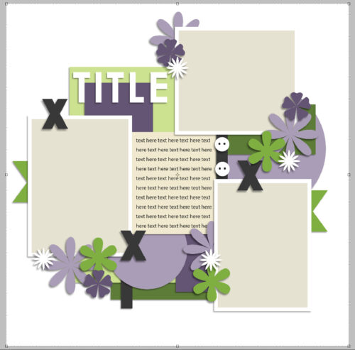 This grid-style template is from Magical Scraps Galore. It’s simple, the photo spots are more or less right for my purposes and there’s an easy way to add a fourth photo. Let’s review.