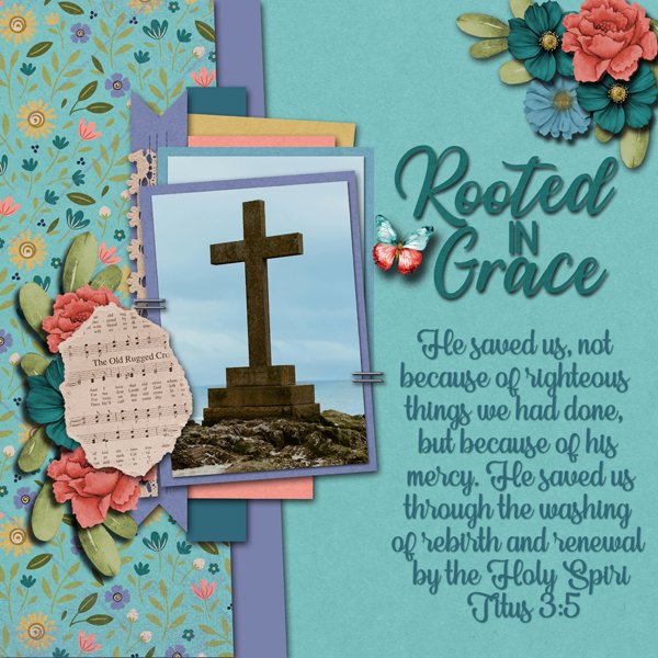 First out of the gate is Windswept. Her layout reflects the Christian Easter theme of resurrection. Her focal point is the photo of a cross atop a hill, as described in the Bible. Her journaling includes “rebirth” in the quote from the book of Titus. The sheet music fragment is The Old Rugged Cross. Everything is connected.