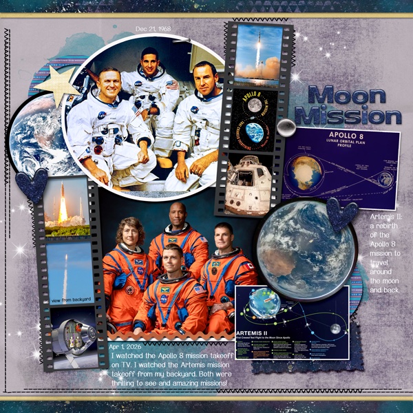 FOr her layout, linweb chose to focus on the recent Artemis II space mission, which she aptly described as a rebirth of Apollo VIII. (Artemis and Apollo were twins. 😉 ) She kept the layout simple to give her photos the spotlight, including a plain star and some pearly accents. What made this event truly special for me was the diversity of the crew, including a Canadian astronaut.