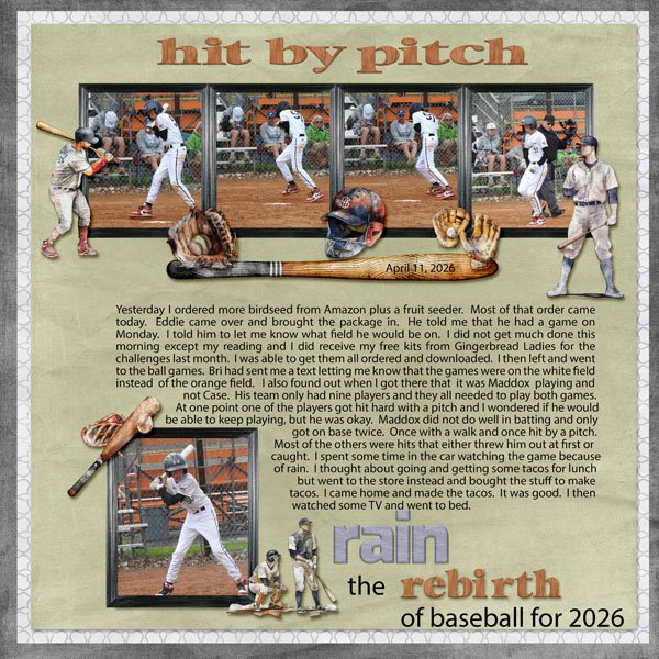 Katherine Woodin chose to chronicle another spring ritual, the beginning of the baseball season. The series of photos at the top under the subtitle shows a stop-action view of the player being hit by a pitch. It sounds to me like the pitcher needs to work on accuracy… Her selection of baseball-related elements supports the subject matter while the title meets the Challenge‘s criteria.
