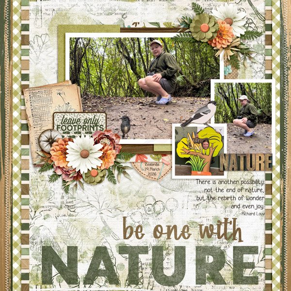 Here, lebjs turned her focus to a spiritual rebirth by communing with nature. She used one of my favourite kits – that I didn’t manage to earn. 🙁 Each of the elements she used works perfectly with her photos AND the topic. Her journaling is a quote from Richard Louv: “There is another possibility, not the end of nature but the rebirth of wonder and even joy.”
