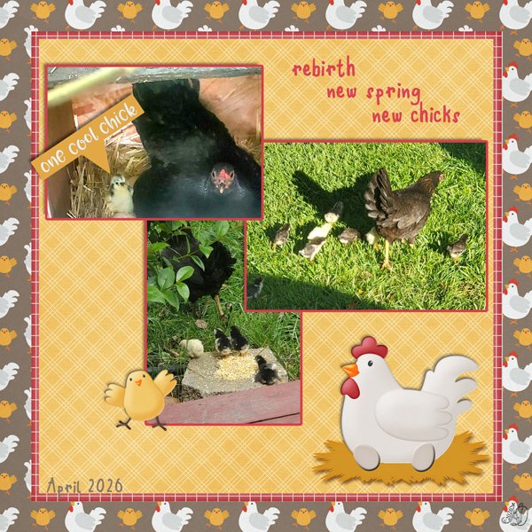 But this layout made me laugh out loud! Brought to us by granny5pics, the theme of rebirth is reflected by these delightful little hatchlings. The chicken-themed papers and elements are great finishing touches.