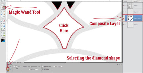Have you processed everything from Parts 1 and 2 yet? Today’s edition will be using a lot of the same processes as the others did. Many of the steps will be familiar for more experienced PSE users. As I mentioned at the end of Part 2, today I’ll be filling in the diamond-shaped (or is it kite-shaped?) spaces. As you can see in the screenshot below, I have the Composite Layer active – the layer with all the various shaped spaces where I put the Copies of the petal shapes. I’ve Zoomed in (using the CTRL/CMD>+ shortcut) on one of the diamonds. Using the Magic Wand Tool (set to Magic Wand and not to any of the other Tool Options) I clicked in the middle of that shape.