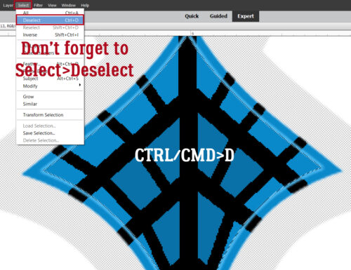 ALWAYS remember to Deselect! Elements won’t let you do anything until you do! You can either use Select>Deselect or CTRL/CMD>D to do it, but make sure it gets done!!