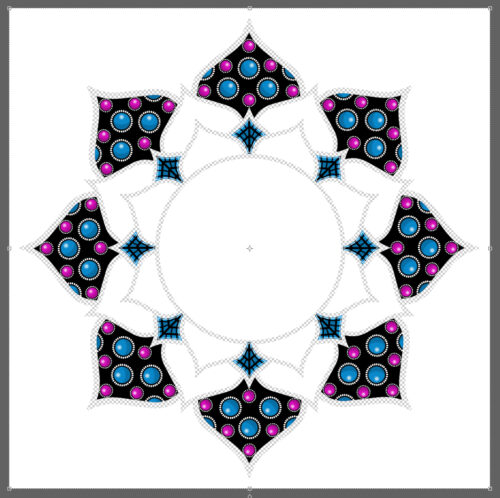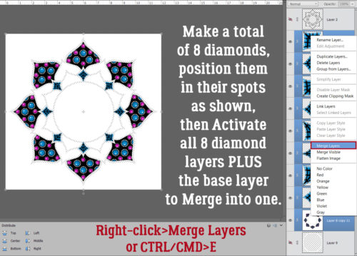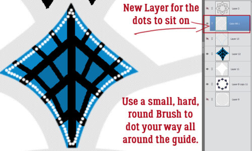 You’ve probably predicted that I’ll put my dotted outline on its own Layer, and you’d be correct. I used a small (3-4 pixel), hard (meaning sharp not fuzzy edges), round Brush and white to dot my way around the Guideline. Then I Merged (CTRL/CMD>E) all the diamond Layers together.