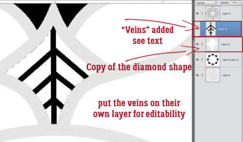 I made a Copy (CTRL/CMD>J) of the diamond shape, which lives alone on its Layer; Then I added a New blank Layer above it where I created the “veins”. By putting the veins on their own Layer, I can later make changes to JUST the veins without messing anything else up. Do you remember how to make lines in PSE? Using the Pencil Tool set to oh, about 8 pixels, and the colour of your choice, click your starting point. Then hold down the SHIFT key and click your end point. Voilà! a straight(ish) line! Now, you might be able to see that there are some marching ants visible in the screenshot, and you might be wondering why… Well, that’s to make sure the lines I’m creating don’t stray outside of the shape I’m filling. See how the top is pointed and the sides are curved? I got the marching ants going by CTRL/CMD>clicking on that white diamond shape while the new Layer was the active one. The Pencil won’t draw outside the shape!