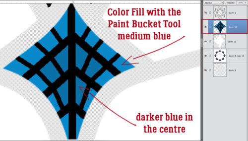 With the marching ants still working, I used the Paint Bucket and a medium blue to Color Fill in some of the spaces created by the veins. Then I went a bit darker with the blue and Color Filled closer to the centre.