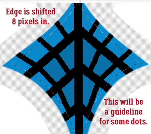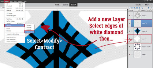 Next I want to add a line of white dots on the inside edge of the diamond. To do that, I again dropped a New Layer on top of the veined, blue diamond, then Selected the outside edge of the white diamond Layer by CTRL/CMD>clicking on it. Select>Modify>Contract will make the Selected edge smaller.