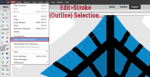 Do you remember this part? I’ll add a Stroke to the Selection to create that Guideline. Edit>Stroke (Outline) Selection
