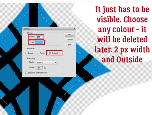 This Stroke can be pretty much any colour I want. It just has to be visible so I can put my dotted trim on it. I’ll be Deleting the Guideline Layer later. The settings are 2 pixels, Color is a turquoise, and the Location is Outside.